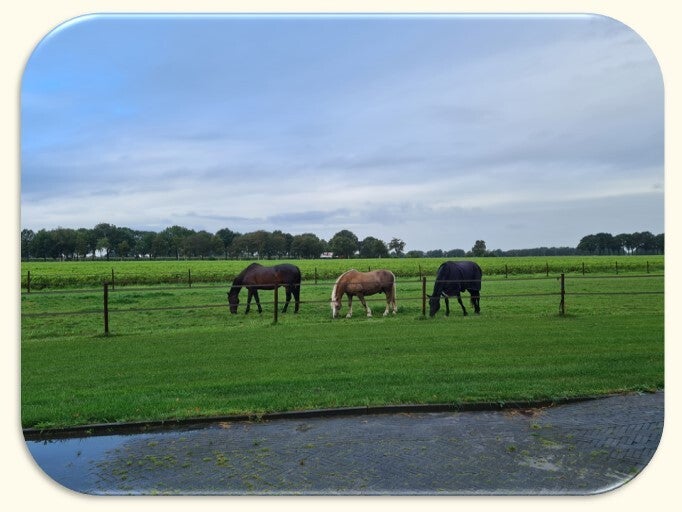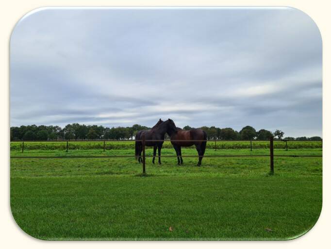 Omdat ik paarden actief inzet in het coachproces, is hun welzijn voor mij essentieel. Coachen is voor een gezond paard niet belastend, zolang het zijn natuurlijke gedrag mag blijven vertonen. Daarom leven de paarden zoveel mogelijk zoals ze dat van nature doen: in een kudde, met volop ruimte, voldoende voer en bewegingsvrijheid. Alleen zo kunnen ze ook in hun kracht staan — en jou helpen om weer in die van jou te komen.